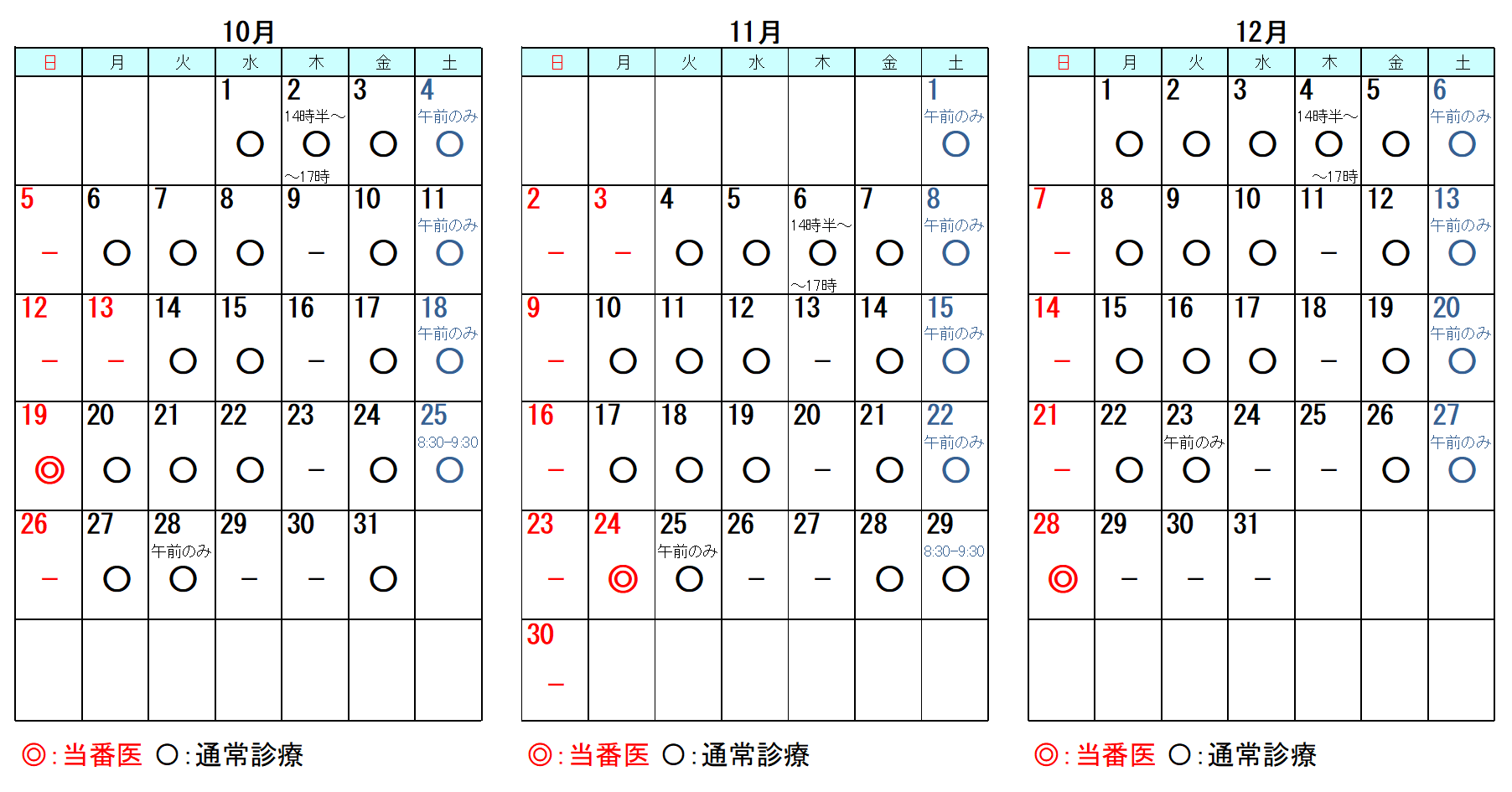 いずれも診療時間は平日とは異なり、午前8時30分〜午後7時です。