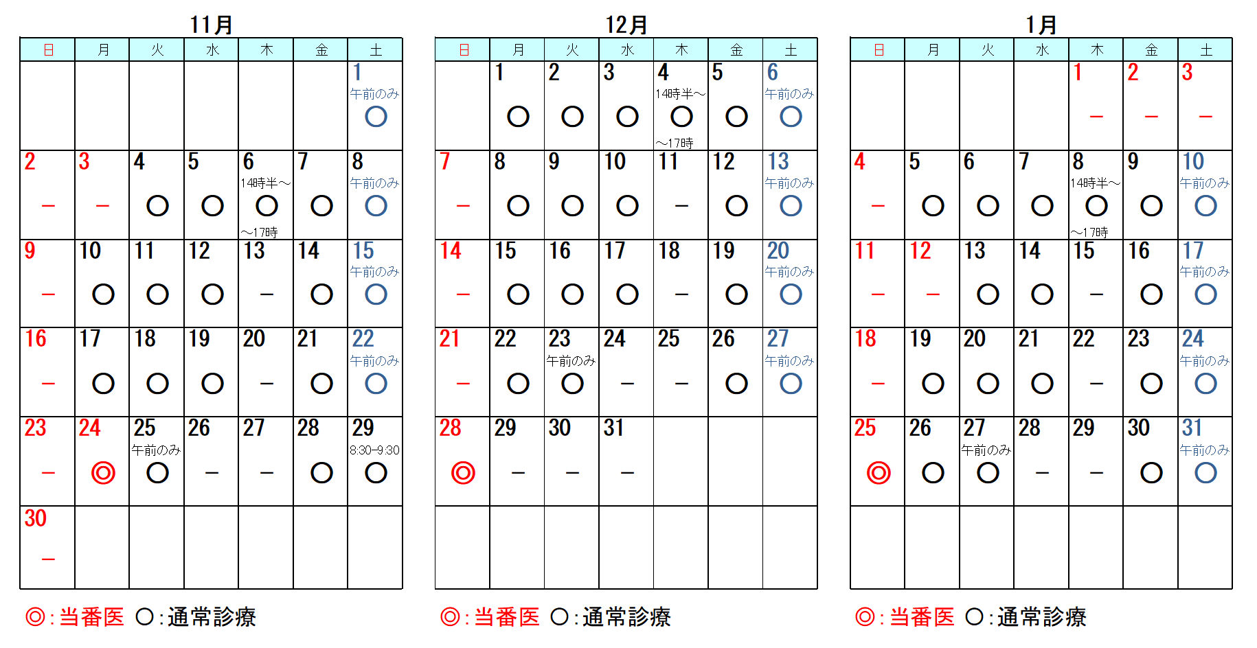いずれも診療時間は平日とは異なり、午前8時30分〜午後7時です。